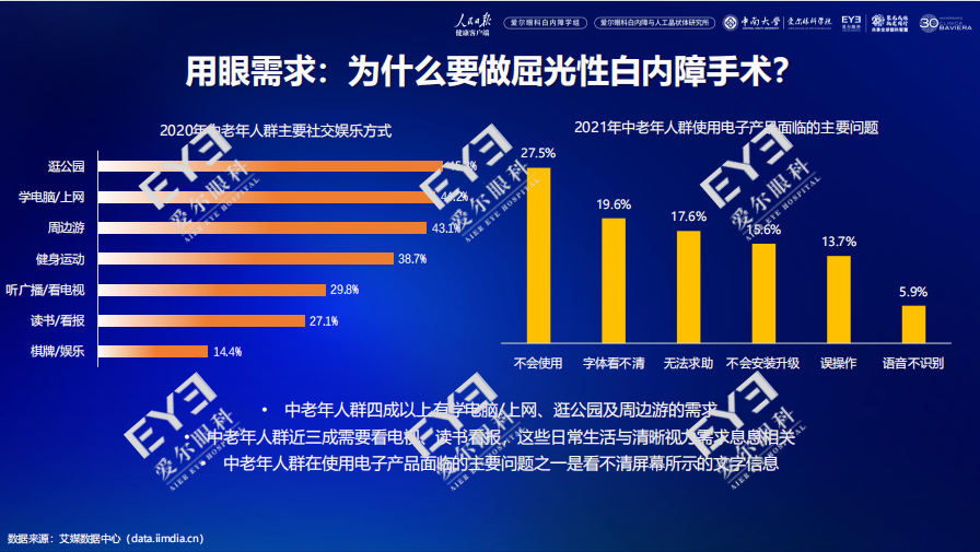 《白皮书》显示,在中老年群体主要社交娱乐方式中,超四成有学电脑、上网、逛公园及周边游的需求,近三成需要看电视、读书看报等。而中老年群体有近两成在使用电子产品时看不清屏幕信息。另据相关数据统计,65岁以上老人30%曾有跌倒经历,80岁以上老人40%至50%曾有跌倒经历[2]。视力下降、视物模糊不仅影响中老年人的社交娱乐,更严重影响他们的身体健康!
