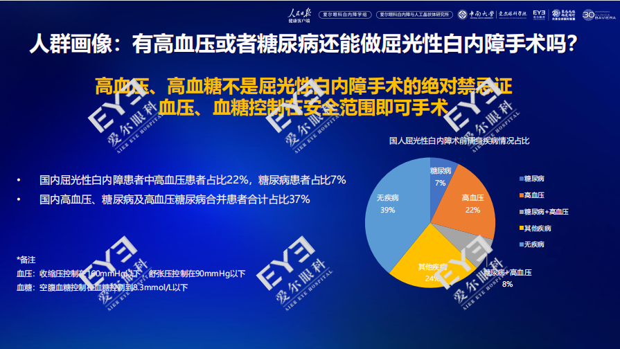 针对中老年人非常关注的高血压、糖尿病患者能否做屈光性白内障手术?《白皮书》也给出了答案。国内高血压、糖尿病、高血压糖尿病合并的屈光性白内障手术患者占比达37%。高血压、高血糖不是屈光性白内障手术的绝对禁忌证,当血压、血糖控制在安全范围内,经医生评估安全后可进行手术。